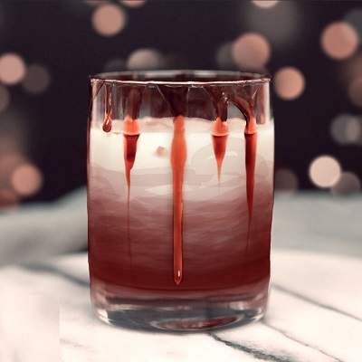 Layer the drink. Start with ice in a rocks glass. Pour red wine first. Shake the heavy cream, vodka, and salted caramel moonshine in a shaker. Pour the contents of the shaker over the red wine gently so it layers on the top and doesn't mix. Garnish with strawberry syrup on the rim of the glass to drip.